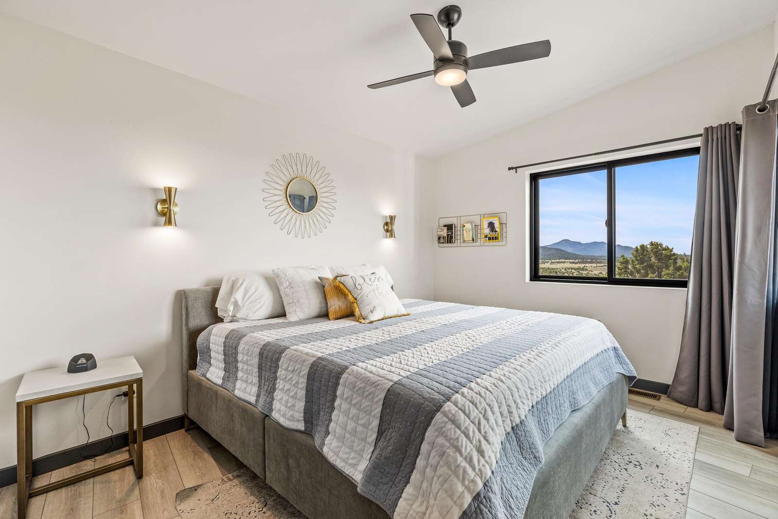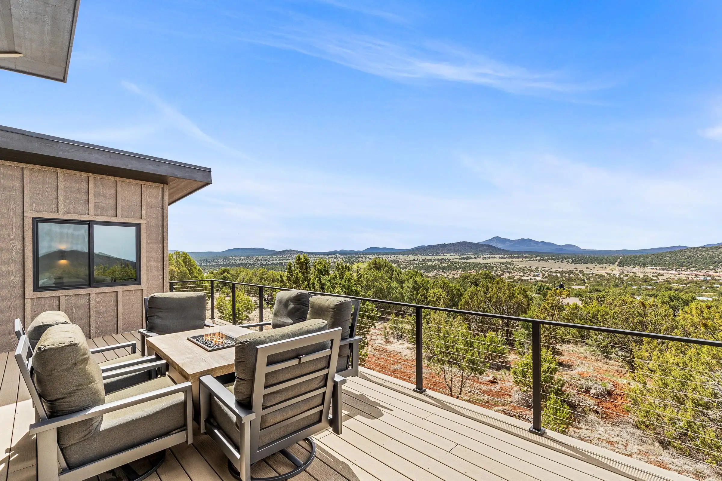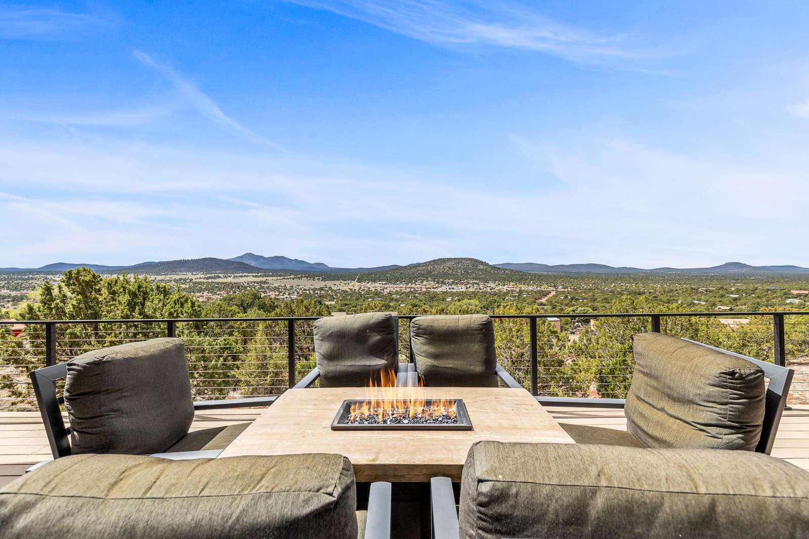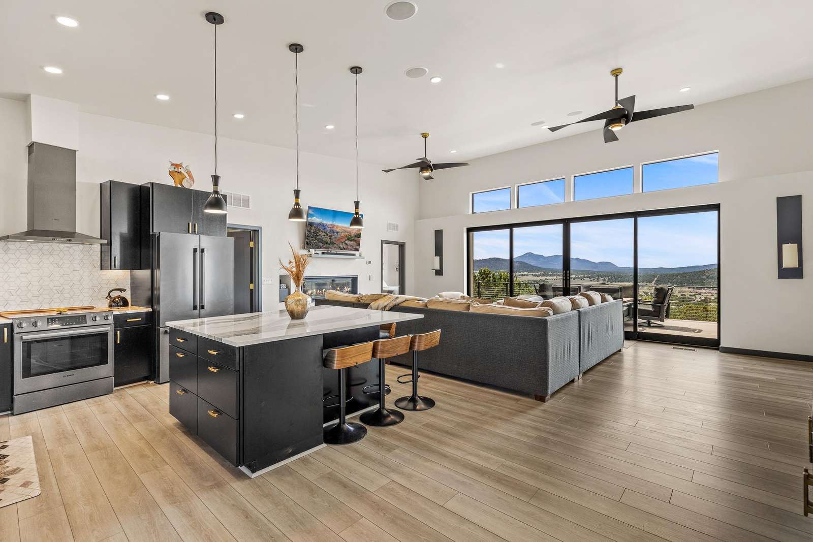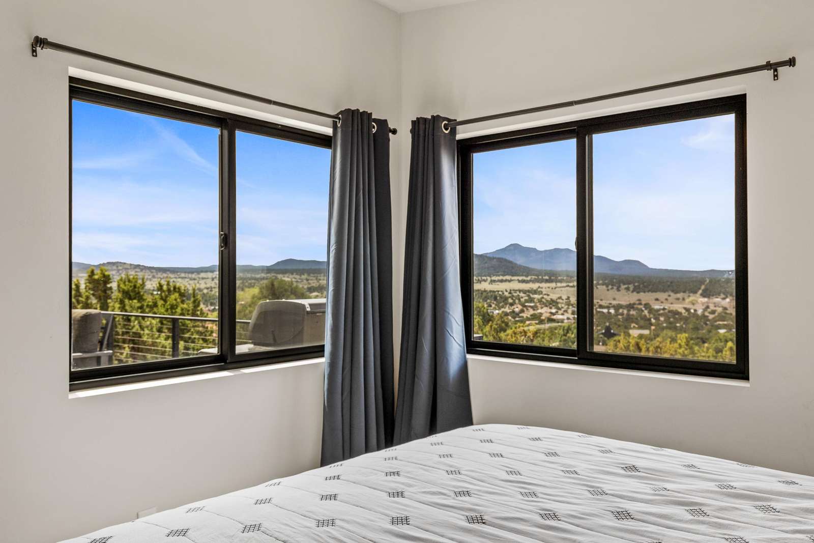 Designed for discerning adult travelers, this 4-bedroom king retreat near the Grand Canyon offers amazing views of Bill Williams Mountain from it's perch high on a hillside. The night sky from the balcony is stunning year-round. Picturesque sunsets enhance the natural beauty. With 4 king bedrooms and a welcoming great room, it’s perfect for friends or family gatherings. The linear fireplace provides warmth on chilly nights. This home is fully equipped for you to arrive and enjoy time together. This home has nothing to occupy small children.