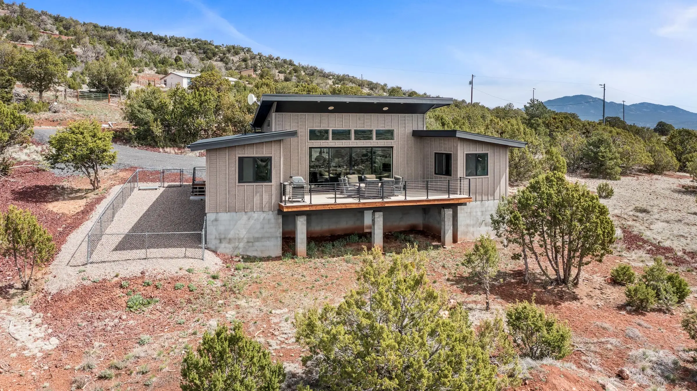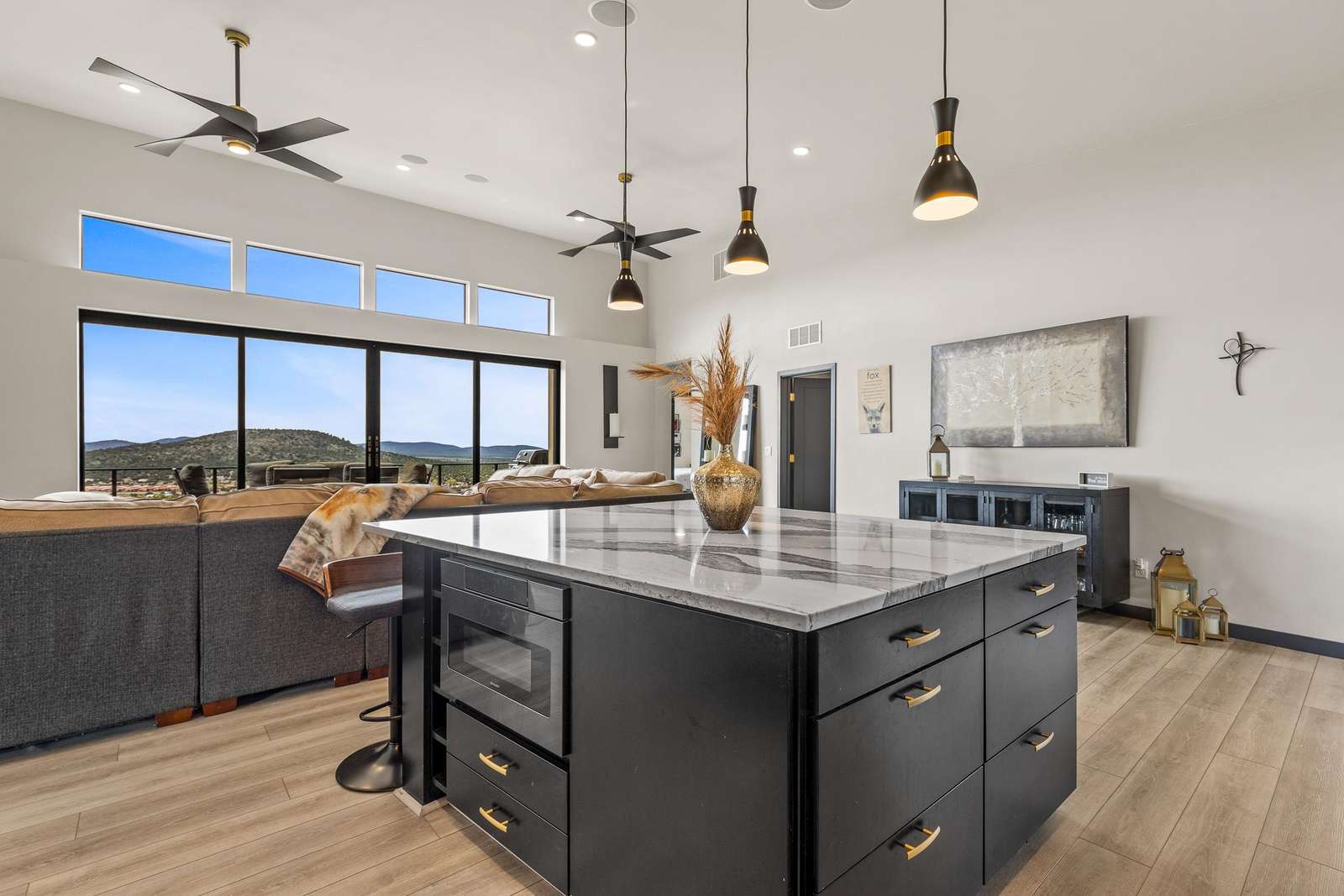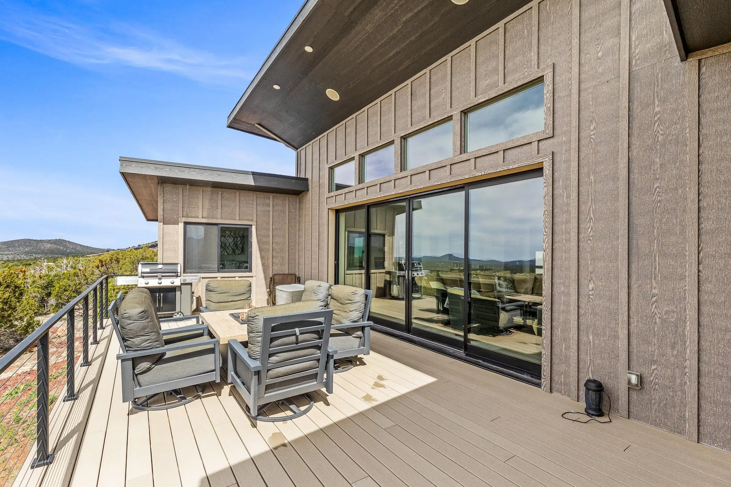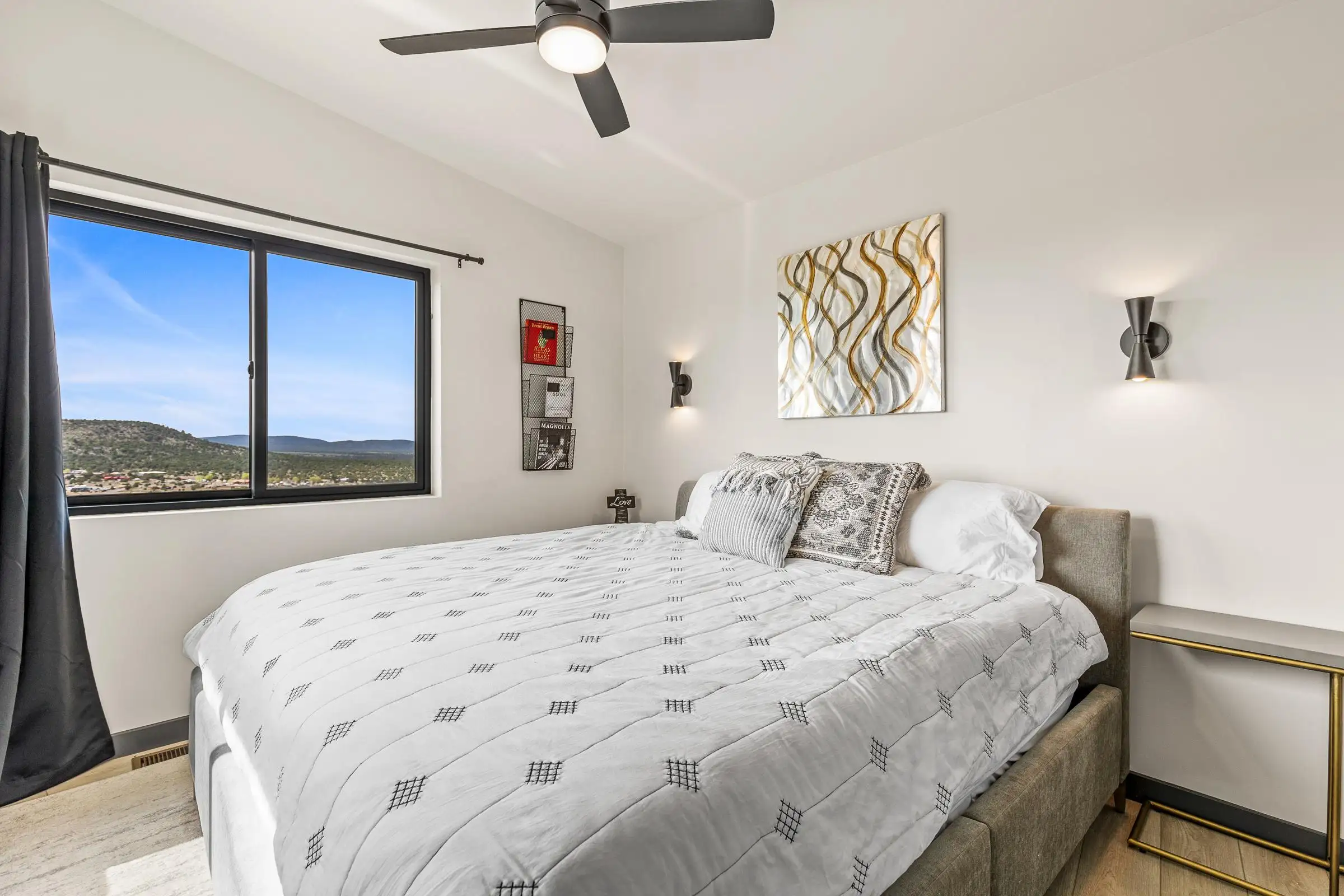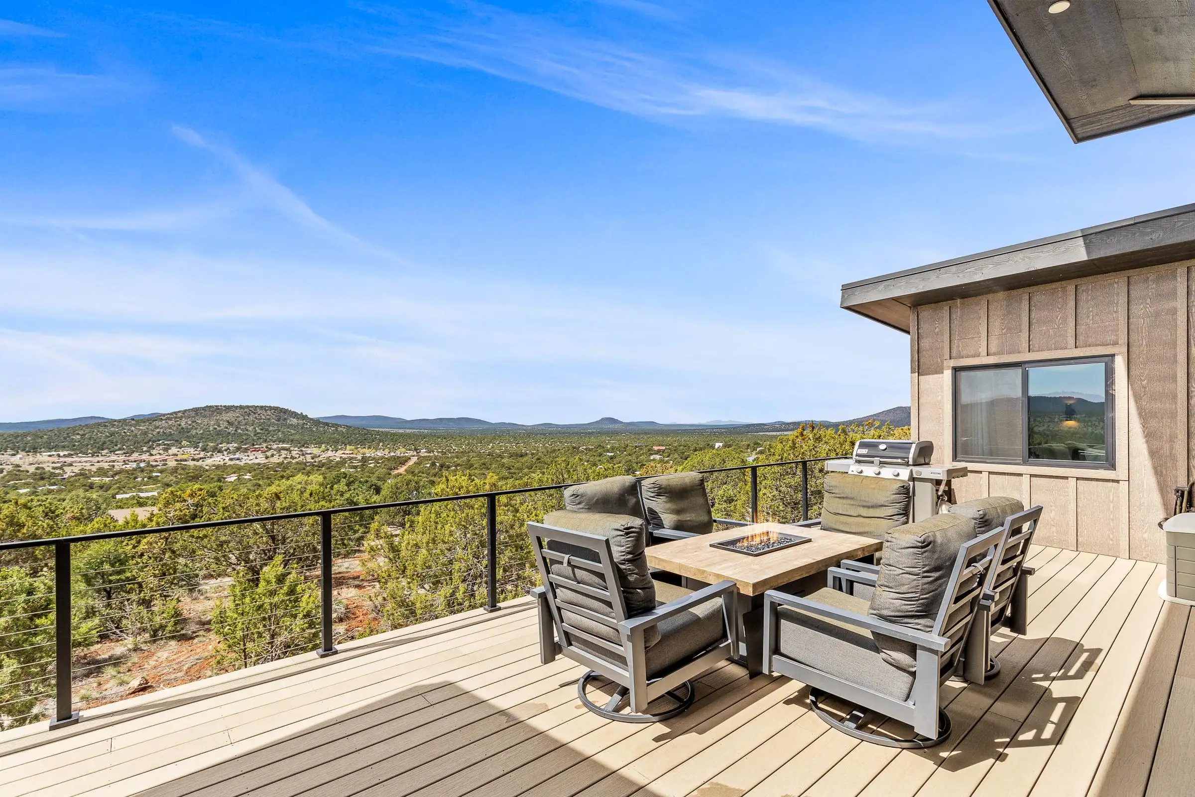 Designed for discerning adult travelers, this 4-bedroom king retreat near the Grand Canyon offers amazing views of Bill Williams Mountain from it's perch high on a hillside. The night sky from the balcony is stunning year-round. Picturesque sunsets enhance the natural beauty. With 4 king bedrooms and a welcoming great room, it’s perfect for friends or family gatherings. The linear fireplace provides warmth on chilly nights. This home is fully equipped for you to arrive and enjoy time together. This home has nothing to occupy small children.